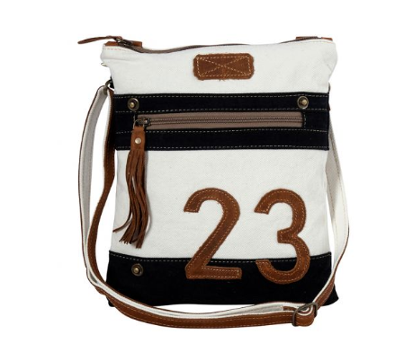 Your lucky number will always be “23” with the charm of this splendid bag. It features a richly textured design with sewn leather numbers set against a two tone canvas background. Front also features an extra zippered pocket, complete with tasseled zipper. Zipper-close top, canvas back with zippered pocket, and rich chocolate leather adjustable, removable shoulder strap. With a fun and light-hearted feel, it’s a unique bag that will be an eye-catching addition to any wardrobe.