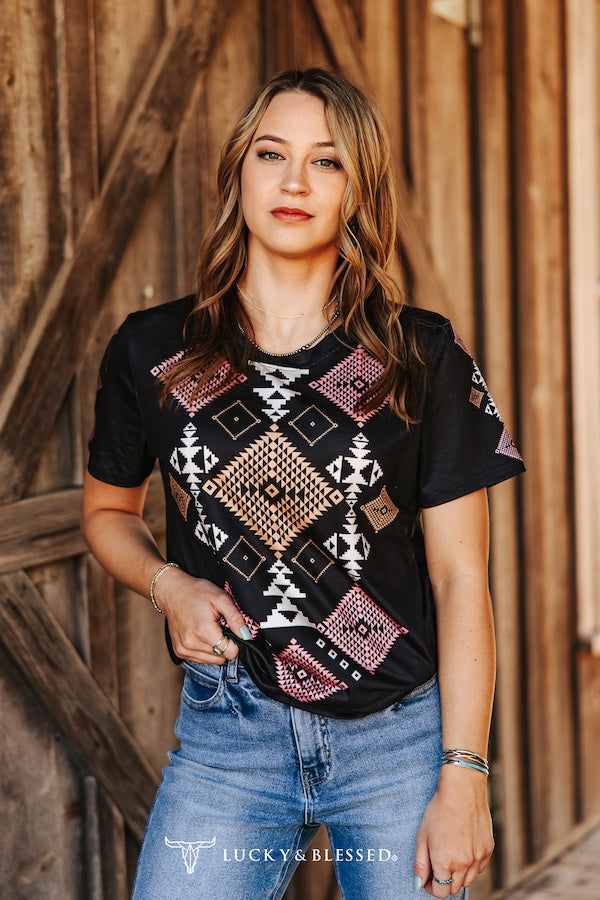 Black Coral Aztec Printed Short Sleeve Stretch Top