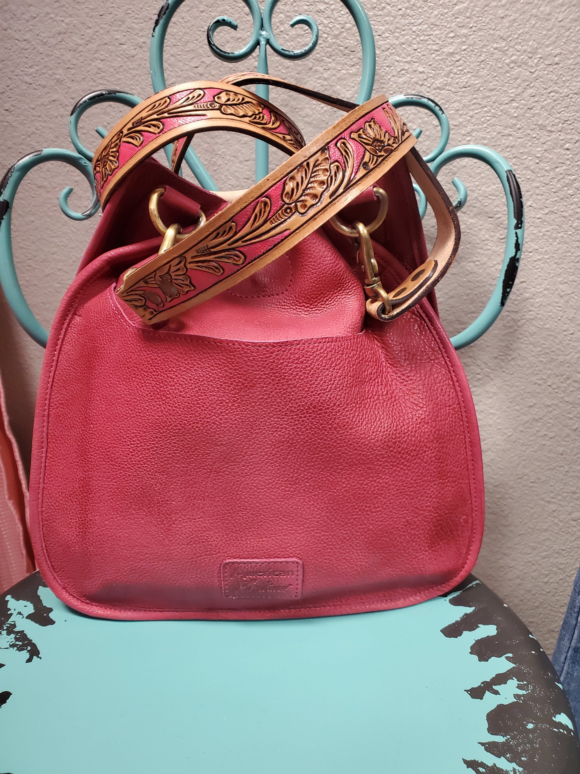 The shoulder strap is adjustable and made of 100% genuine vegetable tanned Cowhide Leather with a hand tooled pattern.