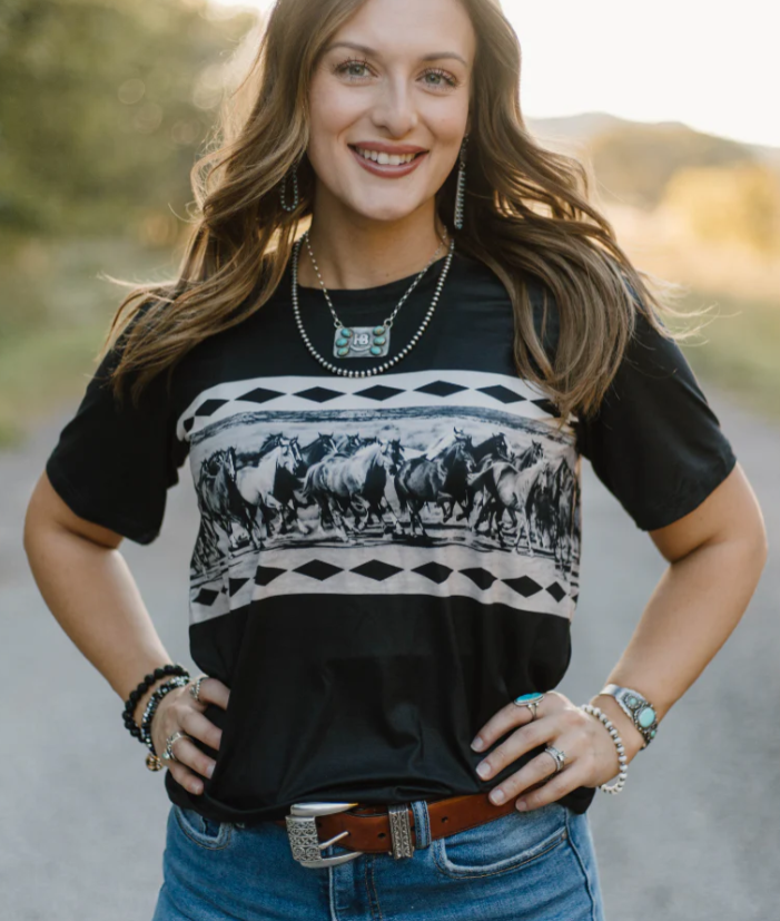 Embrace dynamic style with the Remuda Rush Top, featuring a striking design of a herd of horses in full run accented by subtle buck stitching. This black top brings energy and movement to your wardrobe, perfect for those who appreciate bold, western-inspired fashion with a refined touch.