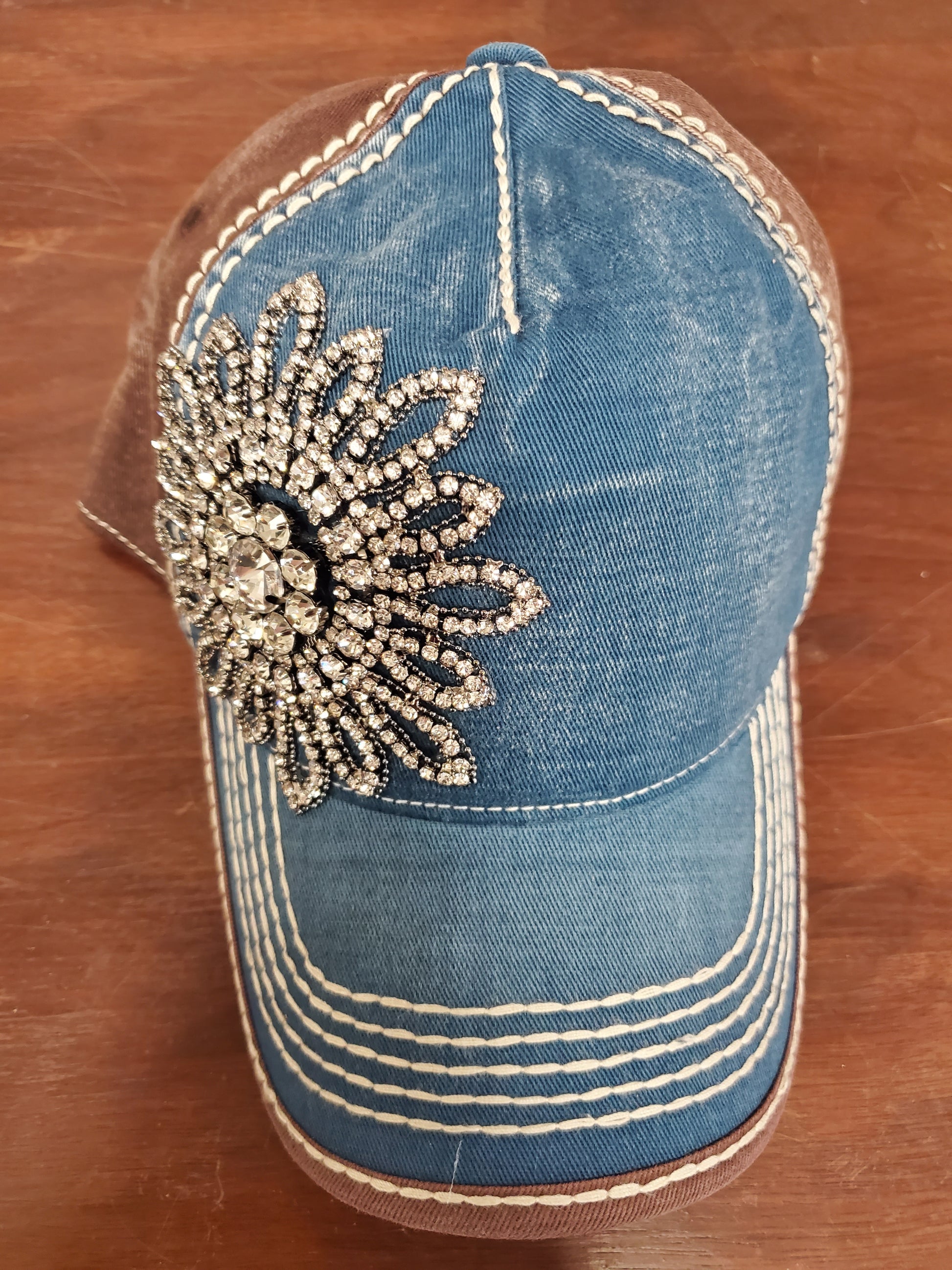 XL glass AB crystal flower two tone high contrast ball cap, adjustable snap-back closure
